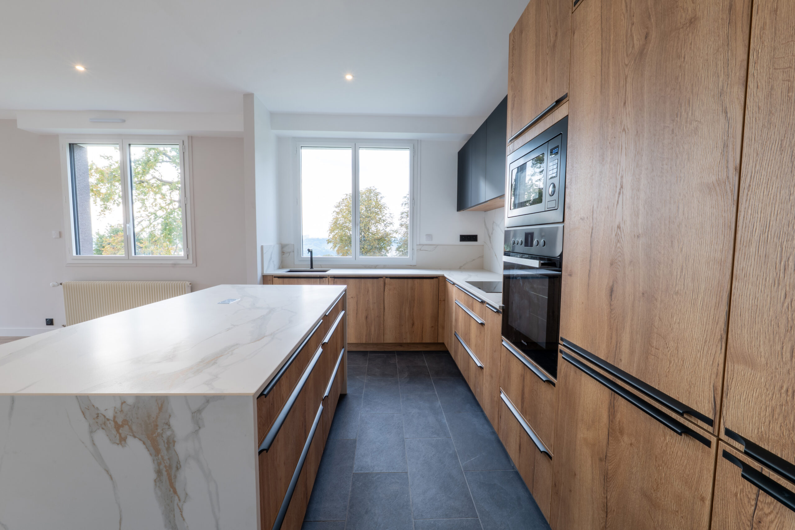Il comprends une vaste entrée, très beau séjour salon avec cheminée décorative, et terrasse plein sud de 30 m² avec vue dégagée, cuisine aménagée et équipée ouverte sur le séjour salon, offrant une pièce de vie de 68 m².